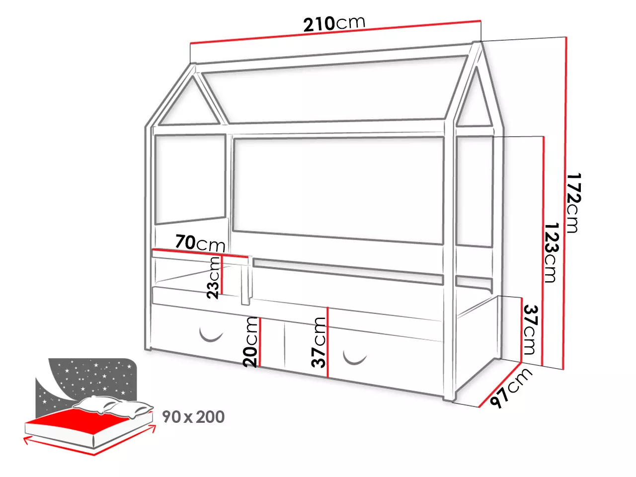 Postel SONTRA 2 s jednoduchým designem dětského domečku je skvělým dekorativním doplňkem do pokoje a podněcuje kreativitu dítěte. Je vyrobena výhradně z masivní borovice a vyniká vysokou stabilností a životností. Oceníte jistě úložný prostor v podobě 2 šuplíků a zábranu, která chrání dítě před pádem z postele.