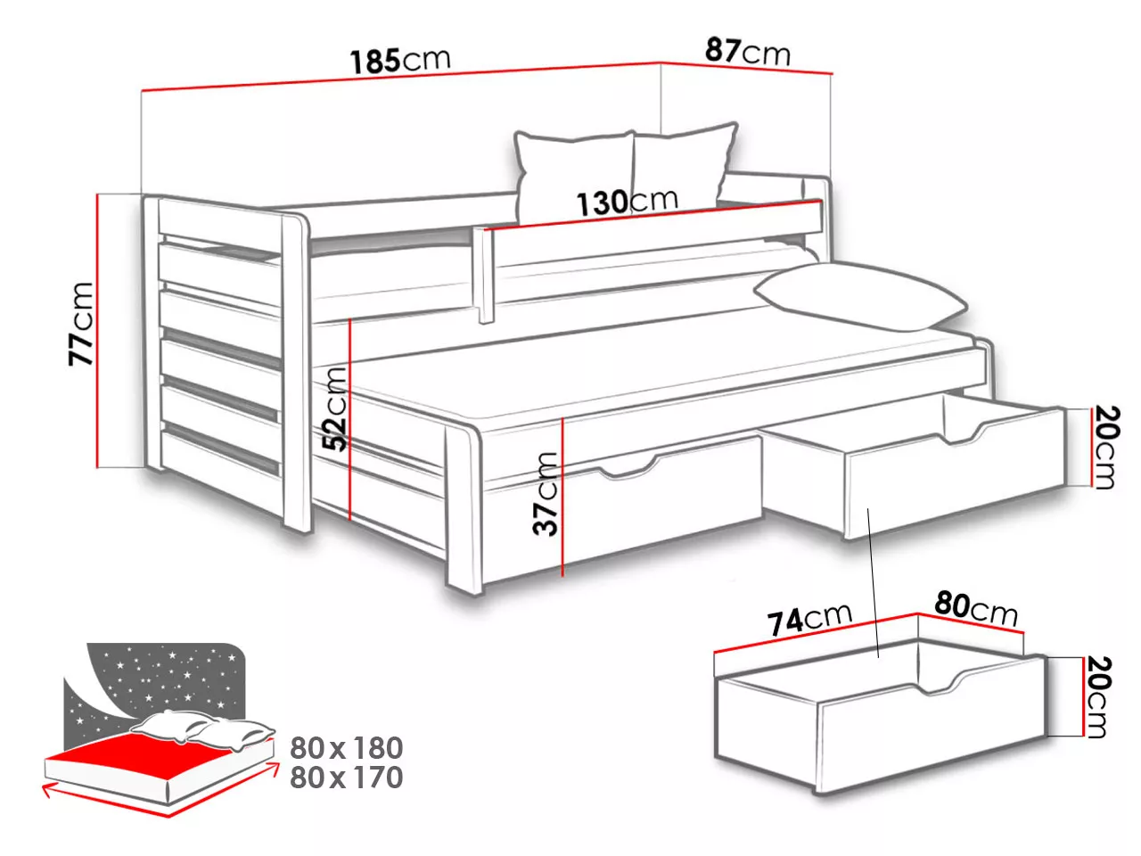 • přistýlka: 87/37/175; ložná plocha: 80x170 cm