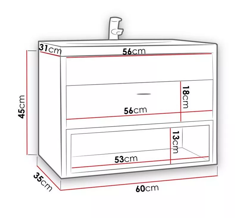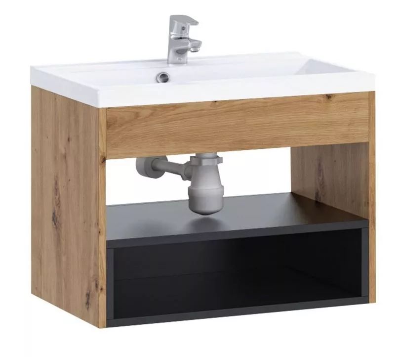 Umyvadlová skříňka BEND je vybavena otevřenou poličkou pro uložení ručníků a šuplíkem na koupelnové doplňky nebo kosmetiku. Skříňka je vyrobena z kvalitní LTD.