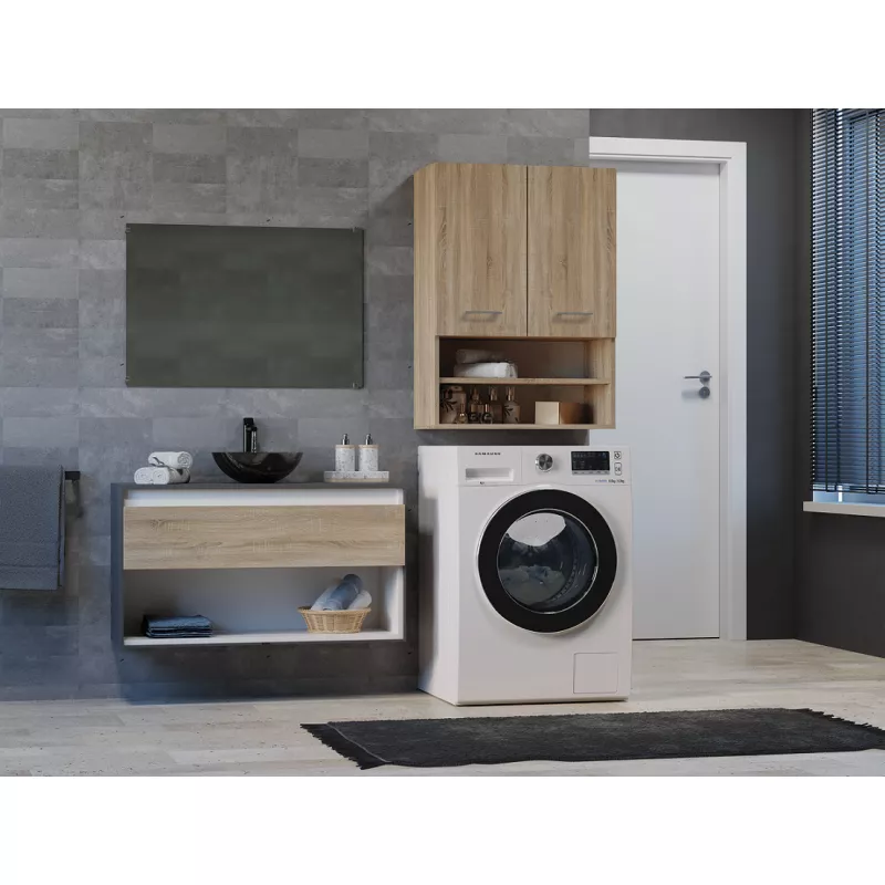Horní koupelnová skříňka MARGO vyřešení nedostatek místa v koupelně, kde efektivně využije volného místa nad pračkou. Za dvířky skříňky se nachází prostorné police, které mohou sloužit k uložení pracích prostředků i ručníků, zatímco otevřené poličky mohou sloužit k vystavení kosmetiky.