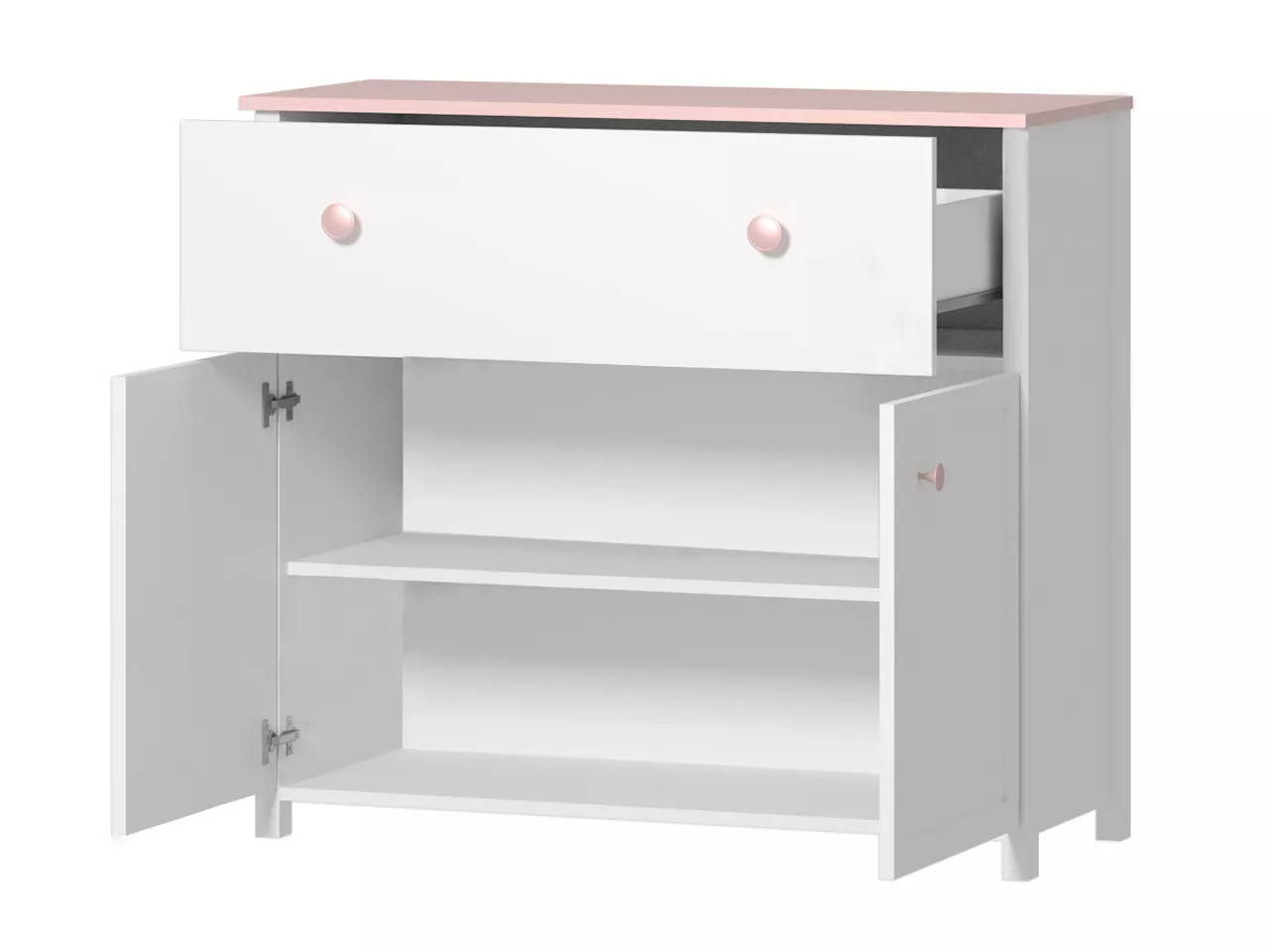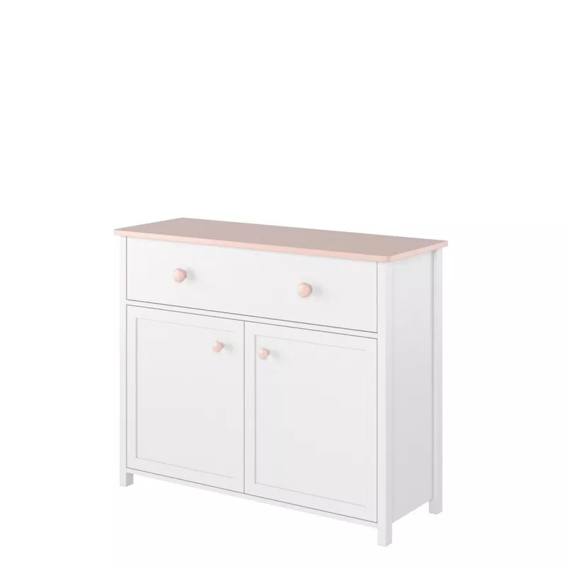 Komoda LEGUAN skvěle zapadne do každého dětského pokoje. Její kouzlo nepochybně vychází z kombinace nadčasové bílé a jemné růžové barvy na horní části komody a úchytkách. Komoda je vybavena velkou a prostornou zásuvkou a skříňkou se dvěma policemi.