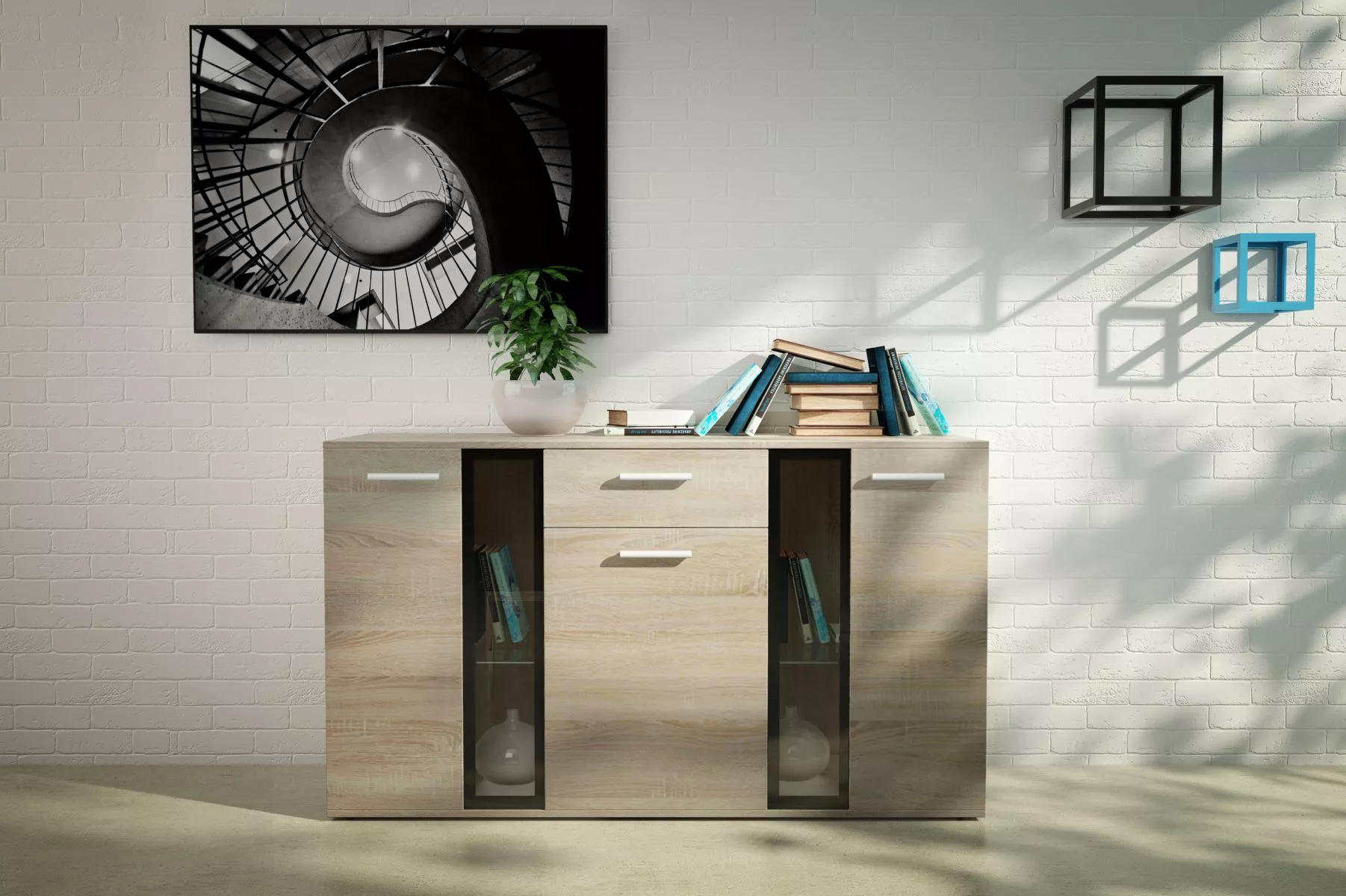 Stylová komoda Sana bude ozdobou každé místnosti. Kromě atraktivního vzhledu oceníte dostatek místa k ukládání věcí, prosklené části využijete k vystavení dekorací. Komoda je vyrobena z LTD desky, která vyniká odolností vůči poškrábání.