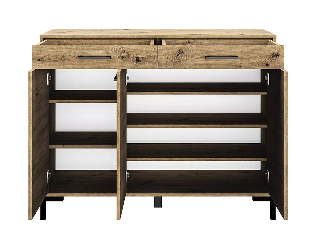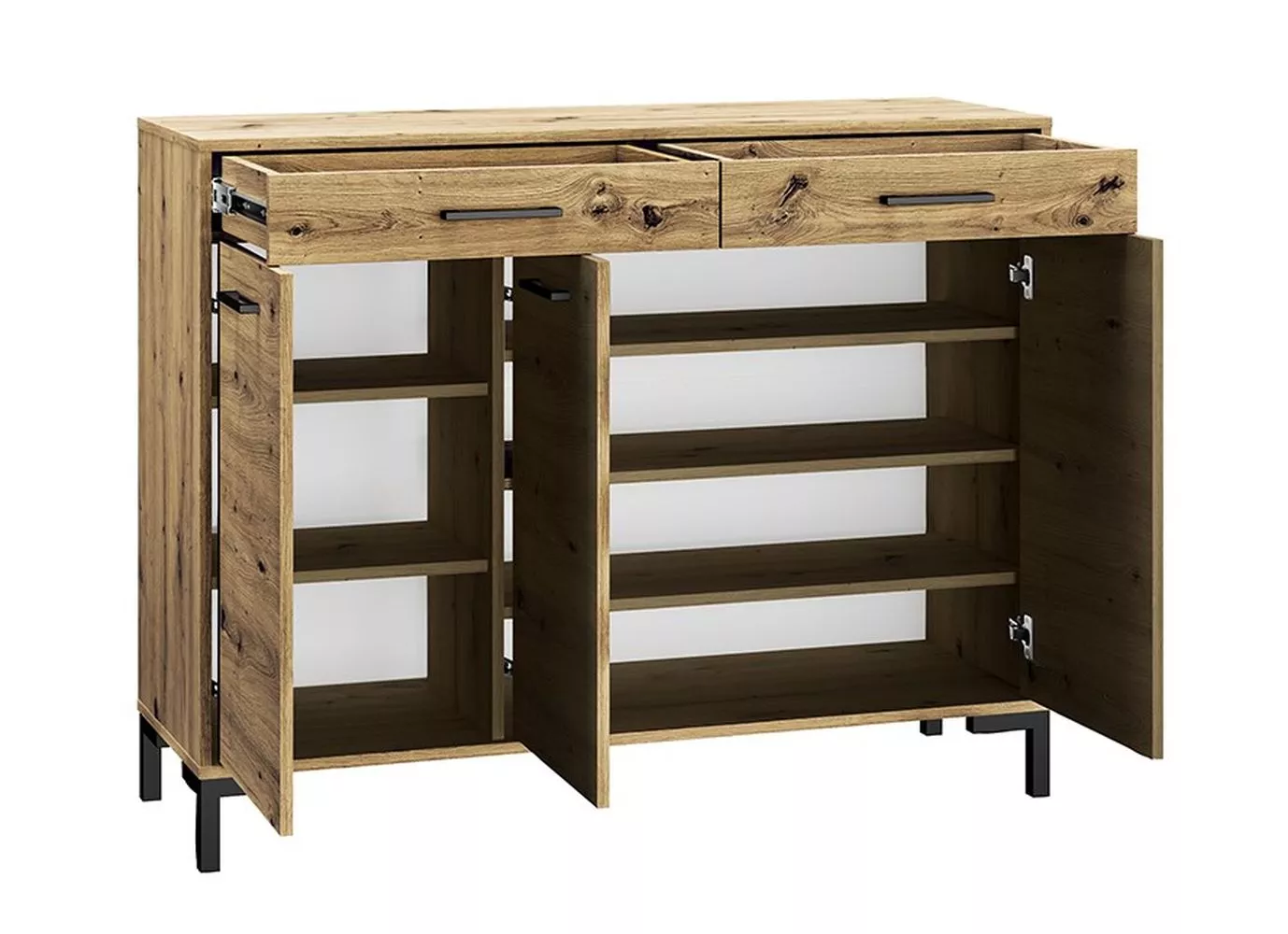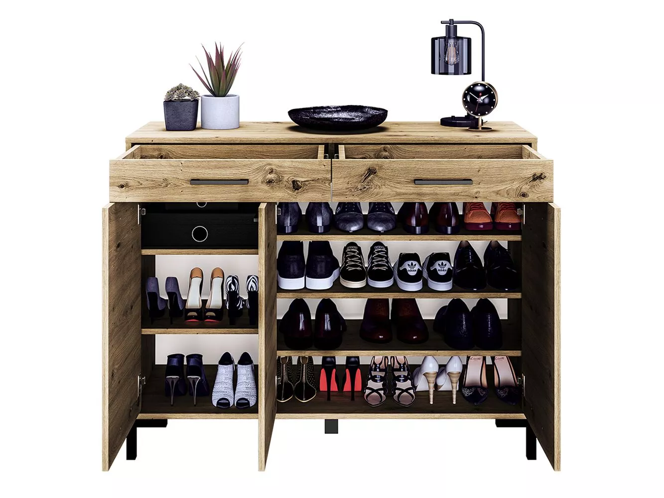 Velká komoda BEDA se hodí do všech moderních předsíní. Nabízí 2 plně výsuvné šuplíky a 5 polic.