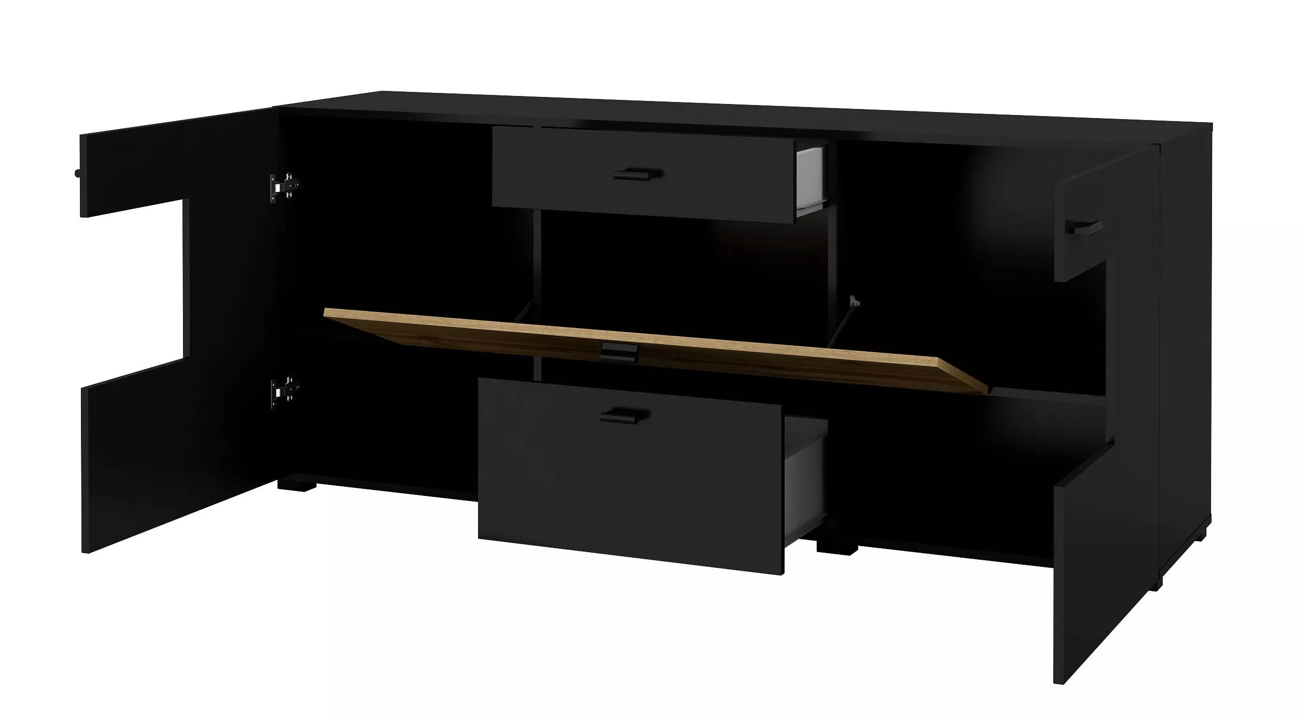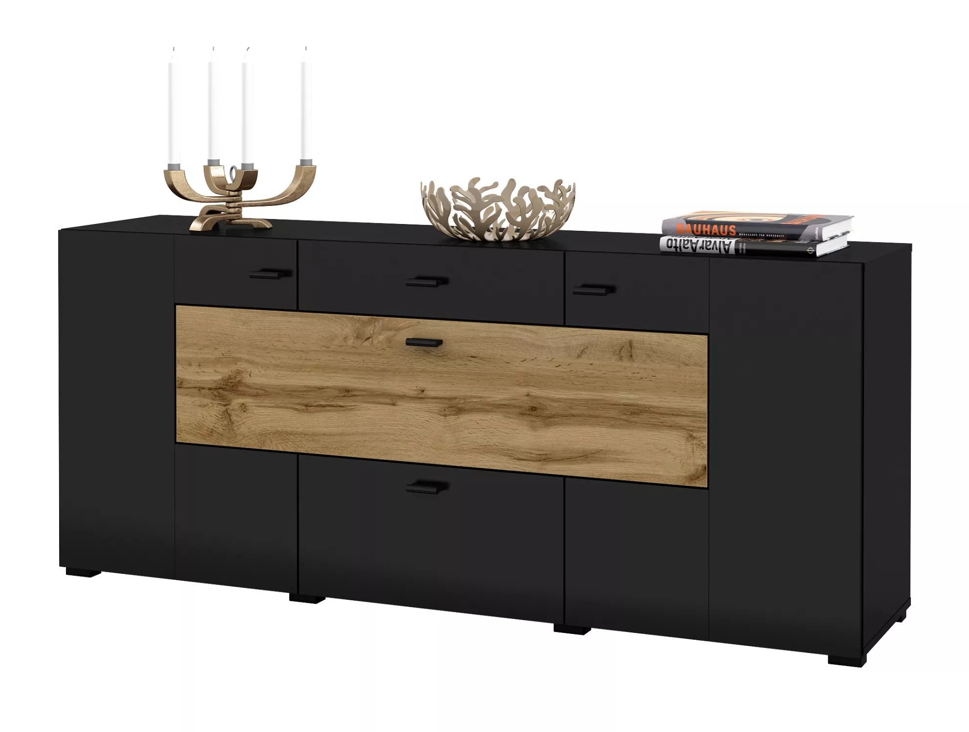 Široká kombinovaná komoda NIKOL se hodí do všech moderních ložnic či obývacích pokojů. Disponuje 5 přihrádkami, 2 šuplíky a 3 dvířky z nichž 1 jsou vyklápěcí.