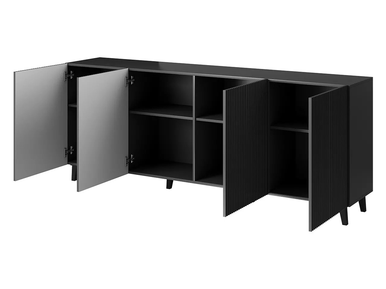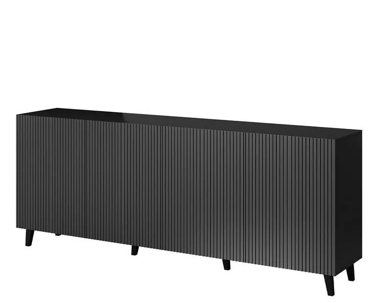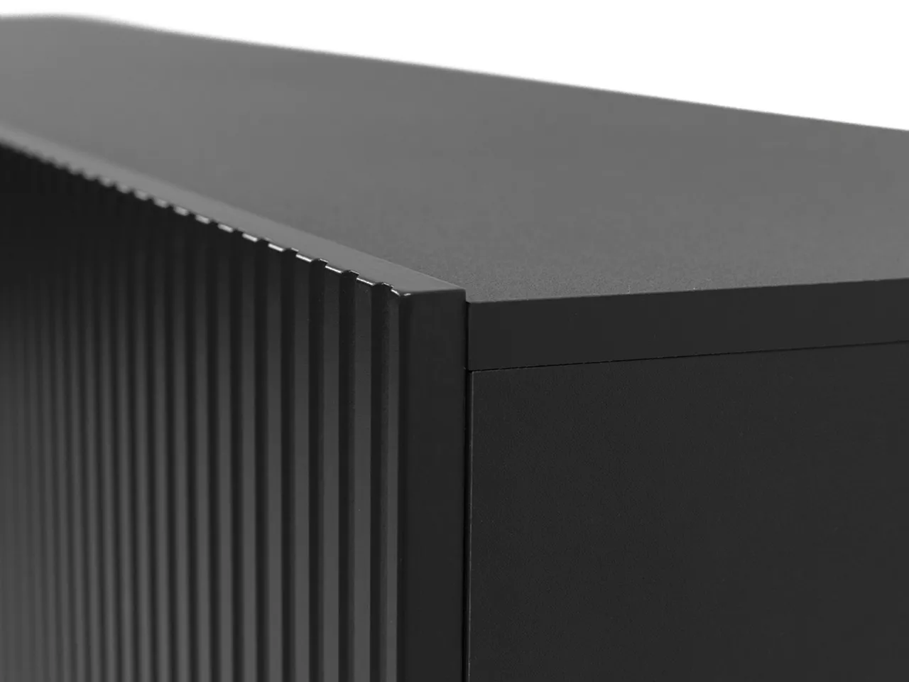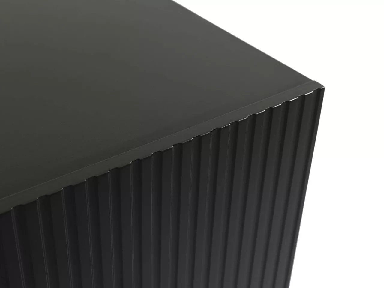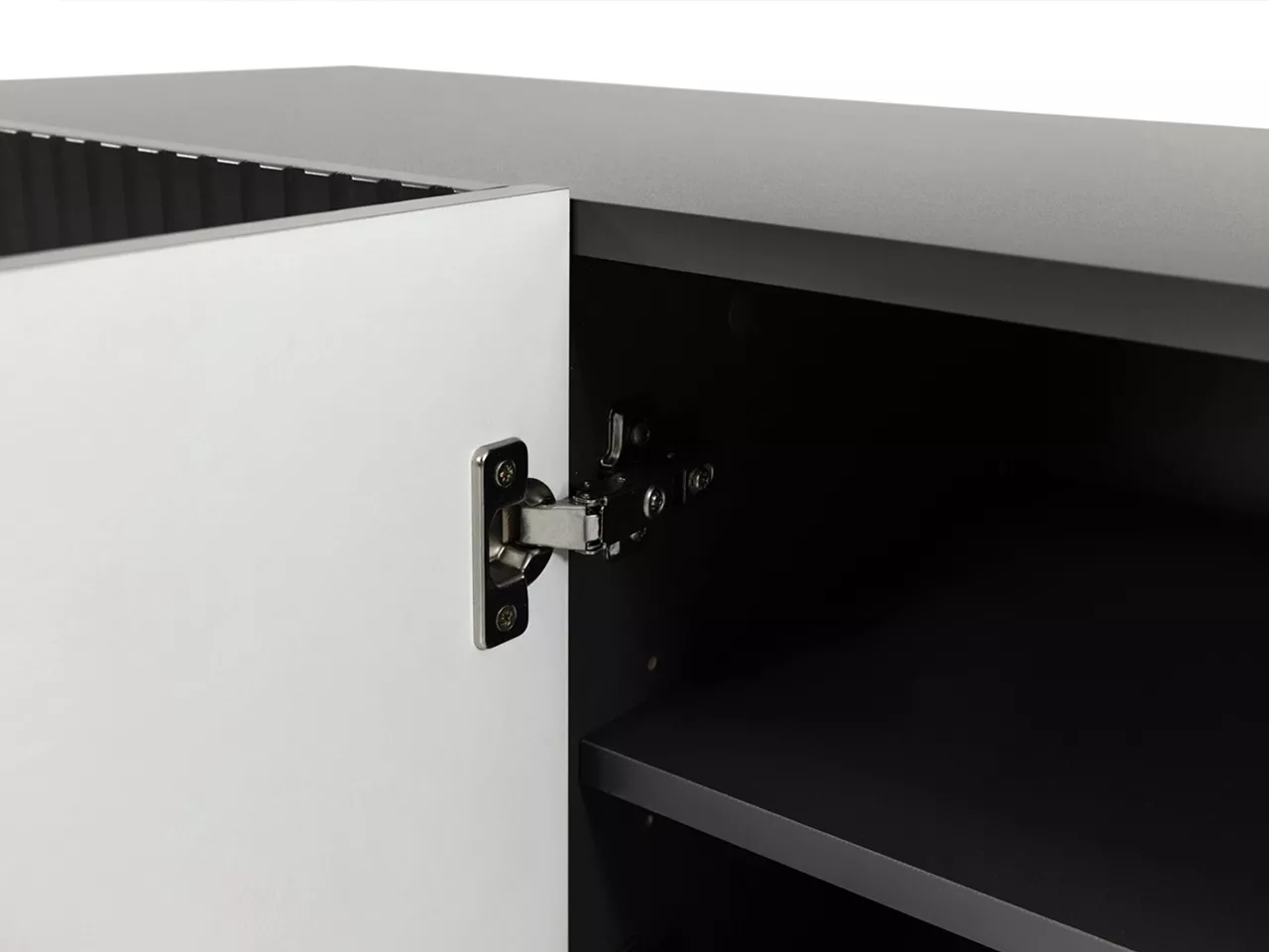 Designová komoda s dvířky HAER 2 se vyznačuje černými vysokými nohami a působivým frézováním dvířek. Chytře organizovaný úložný prostor je rozdělen do několika polic.