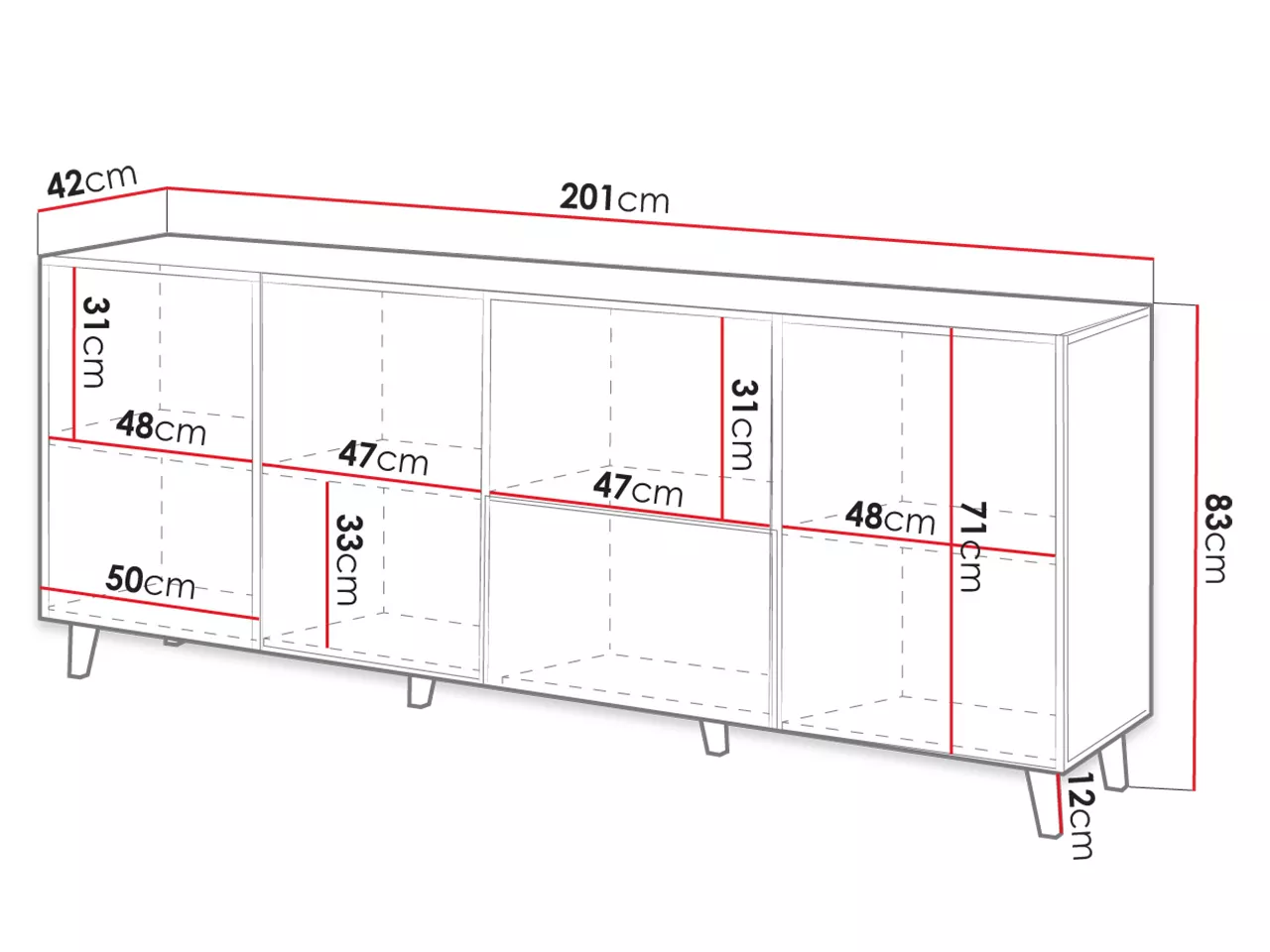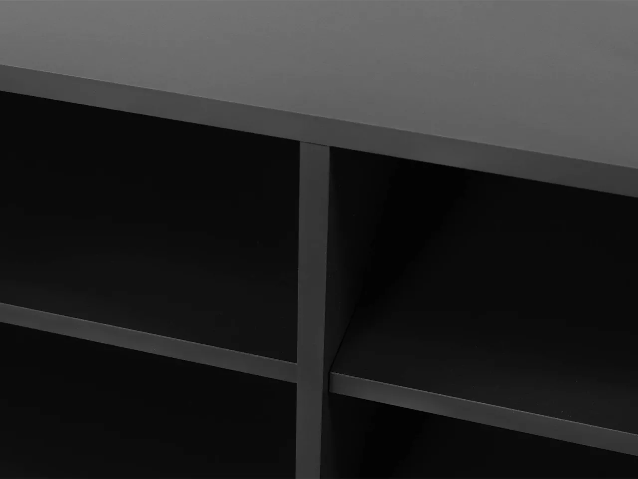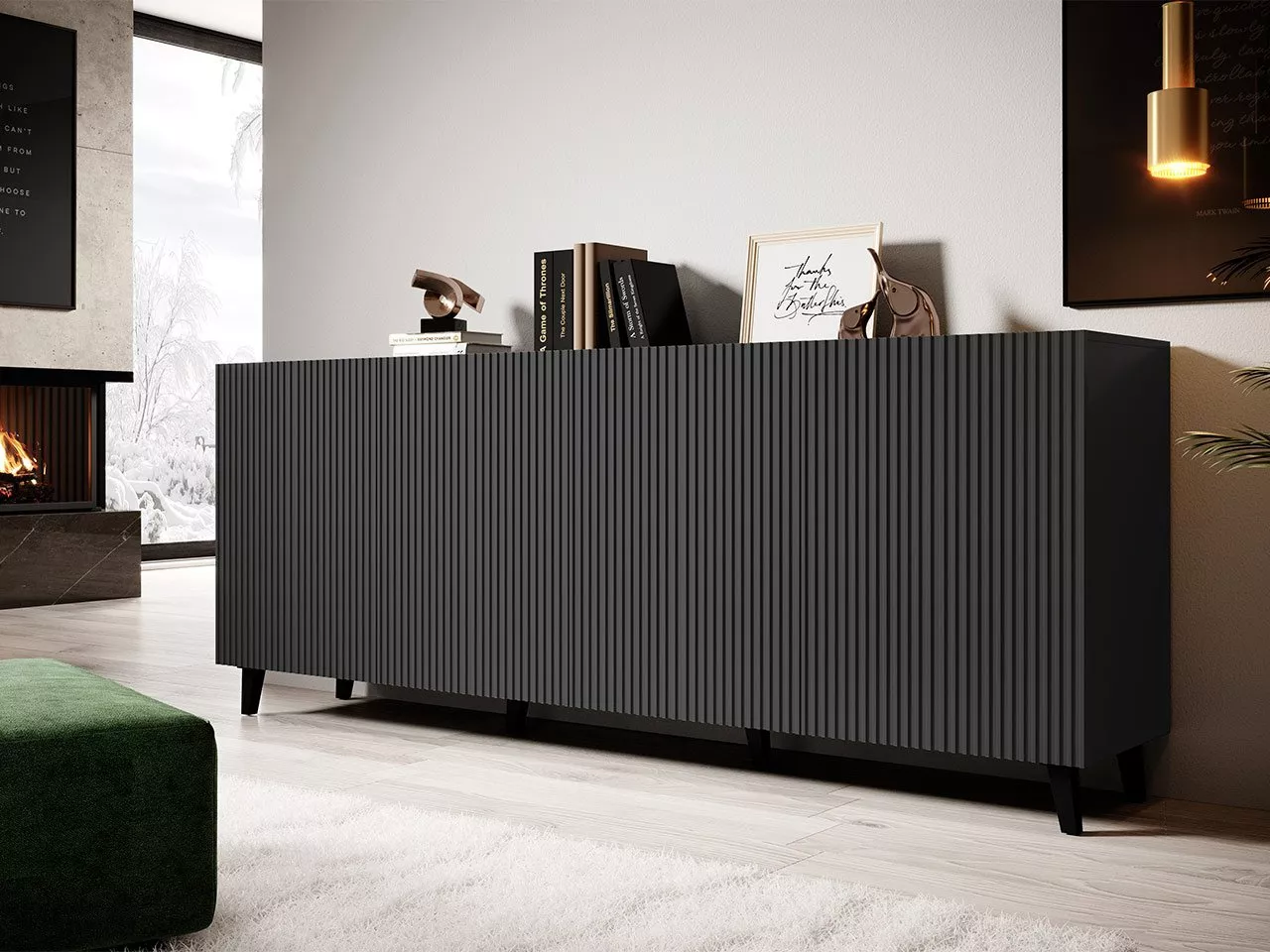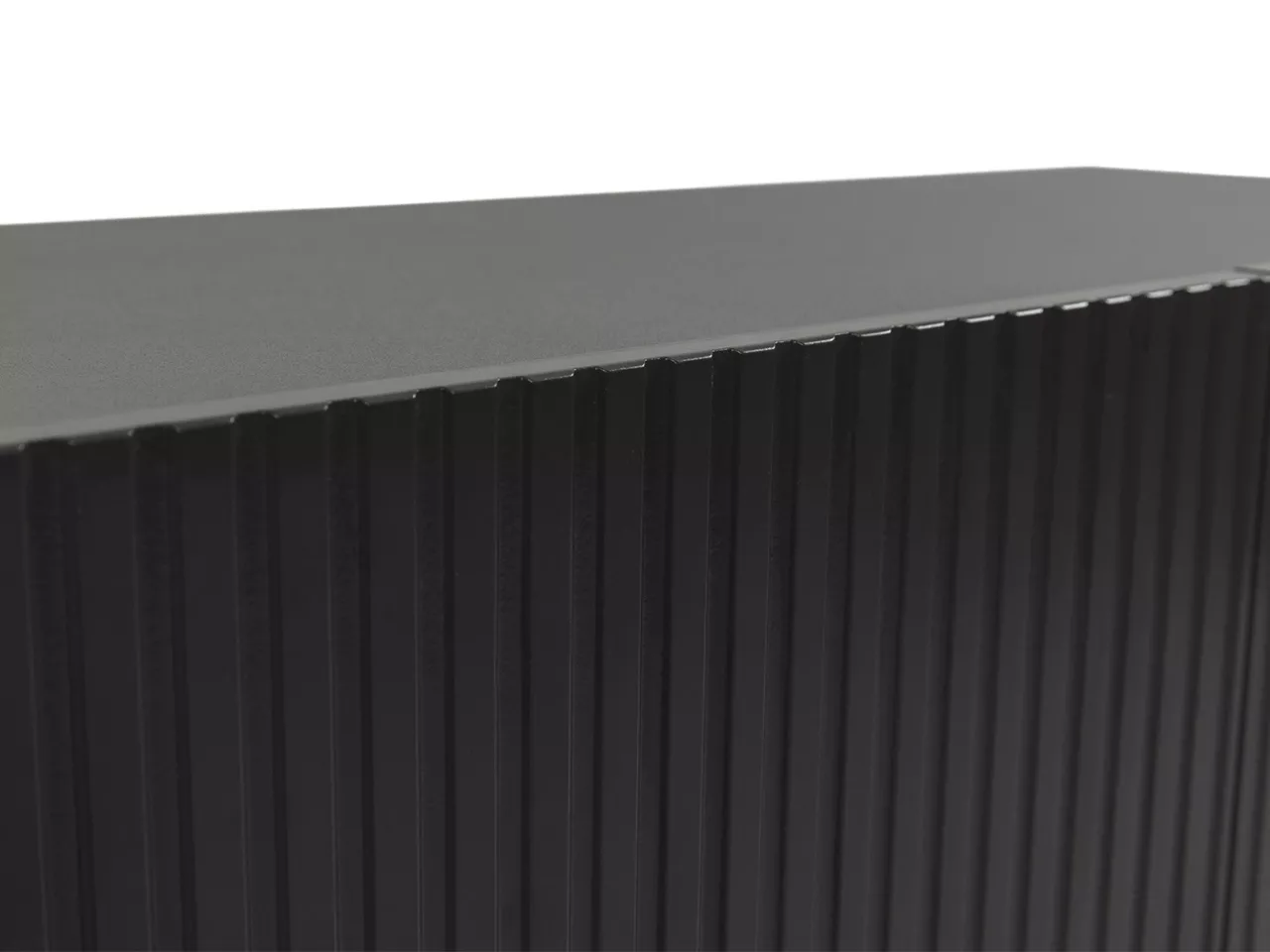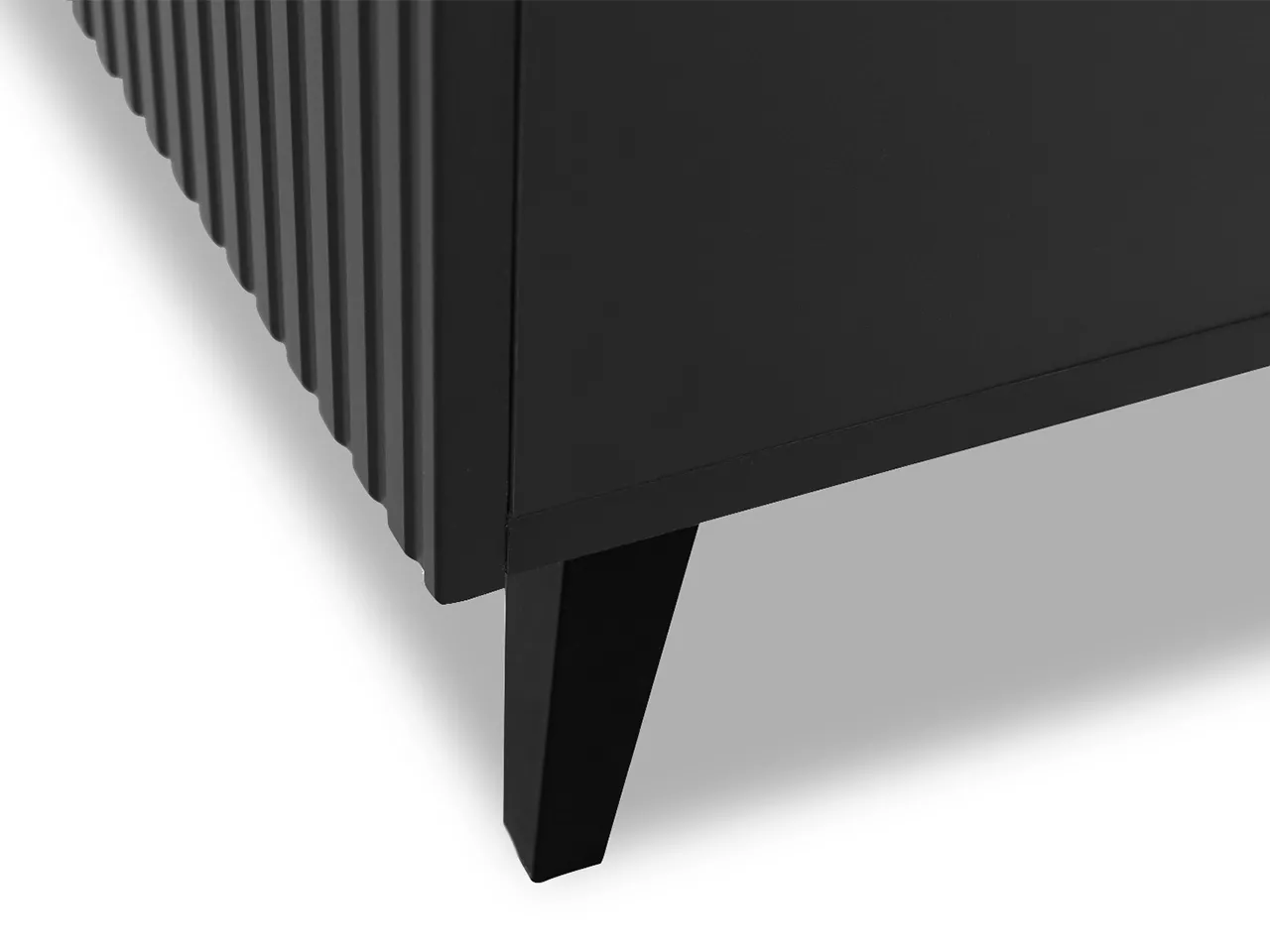 Designová komoda s dvířky HAER 2 se vyznačuje černými vysokými nohami a působivým frézováním dvířek. Chytře organizovaný úložný prostor je rozdělen do několika polic.
