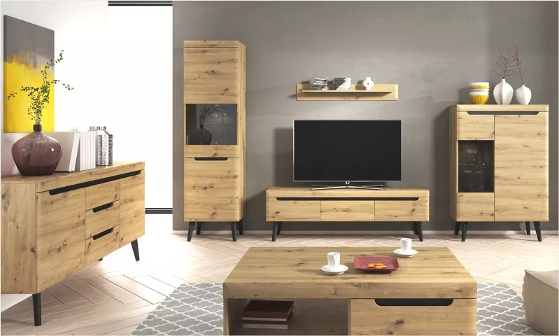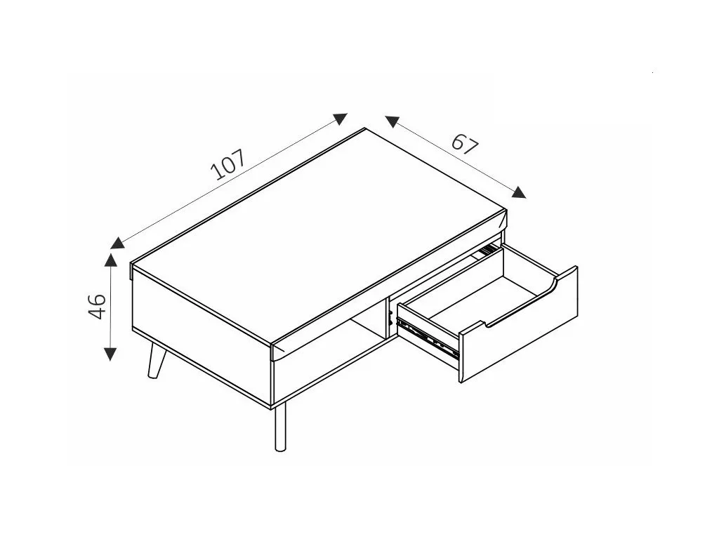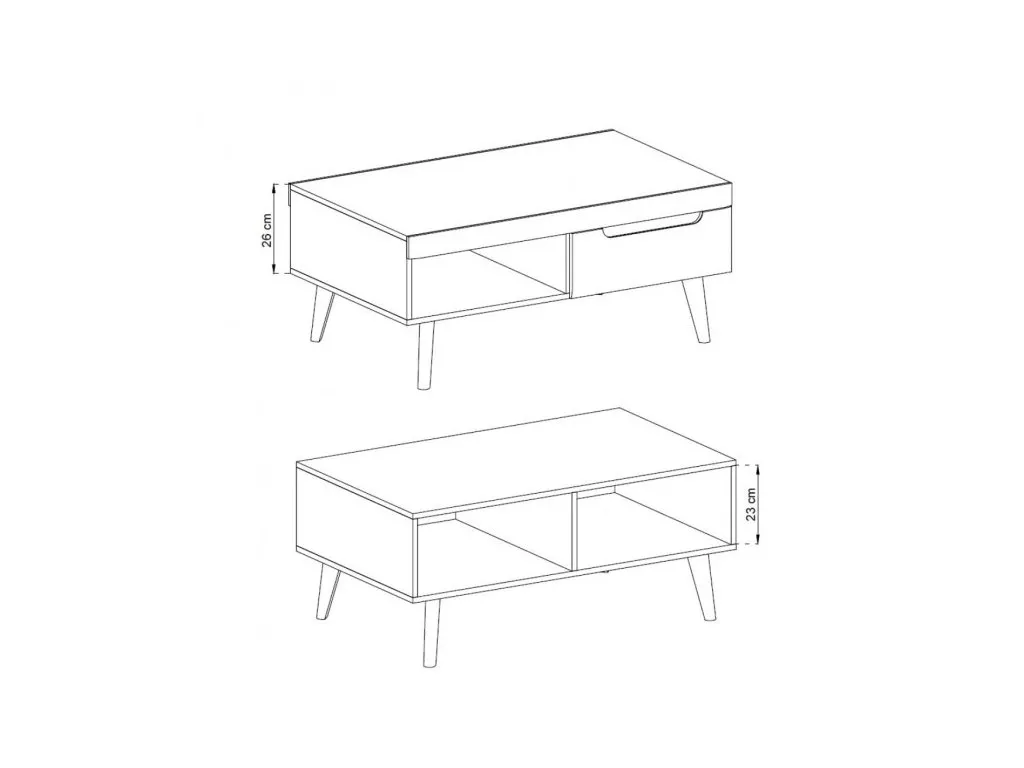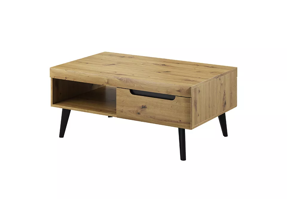 Konferenční stolek v příjemných barvách nabízí spoustu odkládací plochy včetně police a zásuvky. Je spojením krásy a funkčnosti. Poskytuje optimální množství odkládací plochy. Vysoké dřevěné nožičky podtrhují skandinávský, industriální styl.