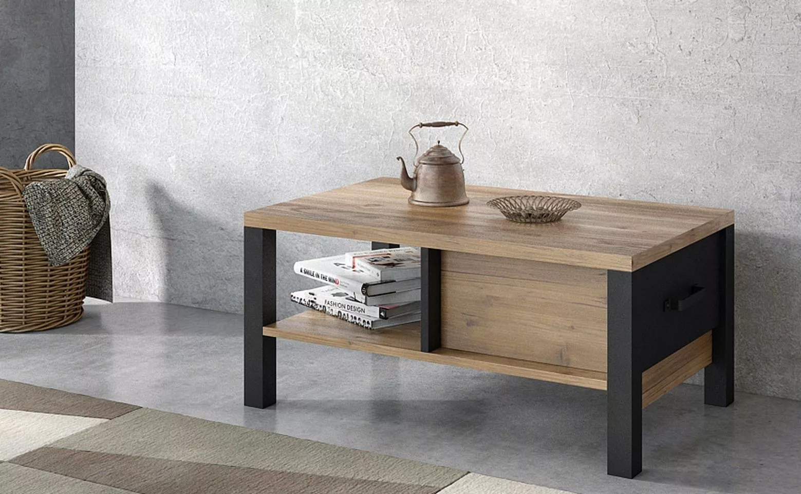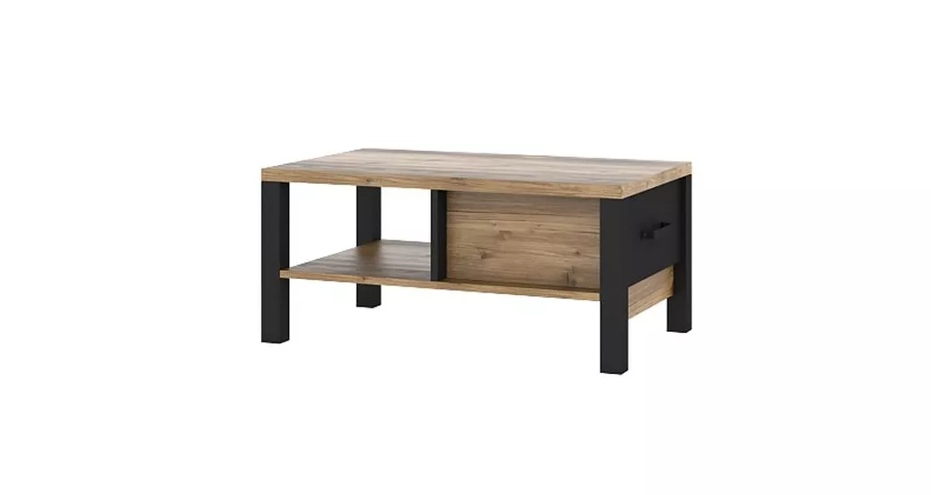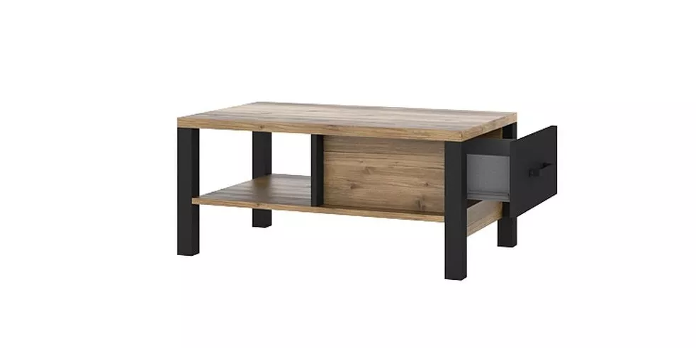 Funkční konferenční stolek OKAL je vybavený jednou zásuvkou a policí. Jednoduchá konstrukce se vyznačuje zajímavým barevným provedením hnědé a matné černé barvy. Konferenční stolek ideálně harmonizuje s prostorem zařízeným v industriálním stylu. Vysoká kvalita provedení z odolné vůči poškození nábytkové desky zajistí používání po dlouhá léta.
