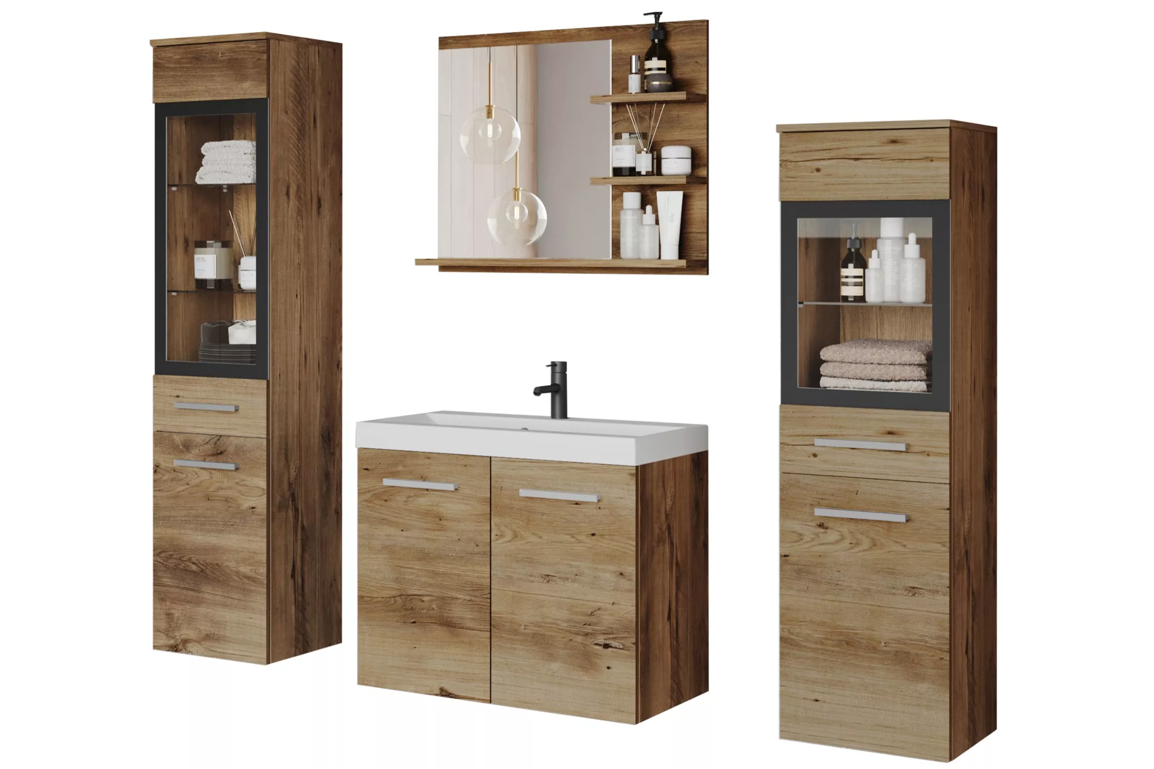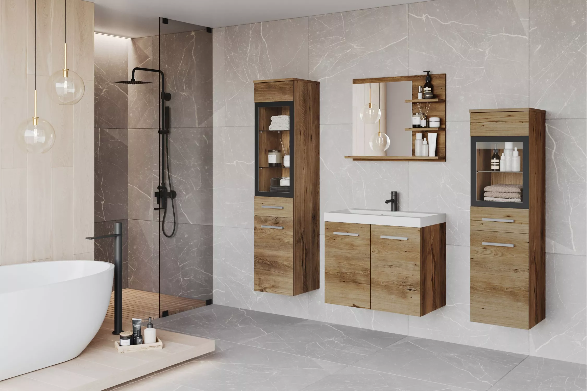 Koupelnovou sestavu ESTELA I tvoří 2 závěsné skříňky, umyvadlo z litého mramoru, skříňka pod umyvadlo a police se zrcadlem. Odolné LTD a ABS hrany chrání nábytek před mechanickým poškozením a vlhkostí.