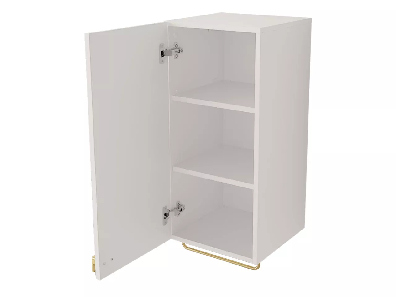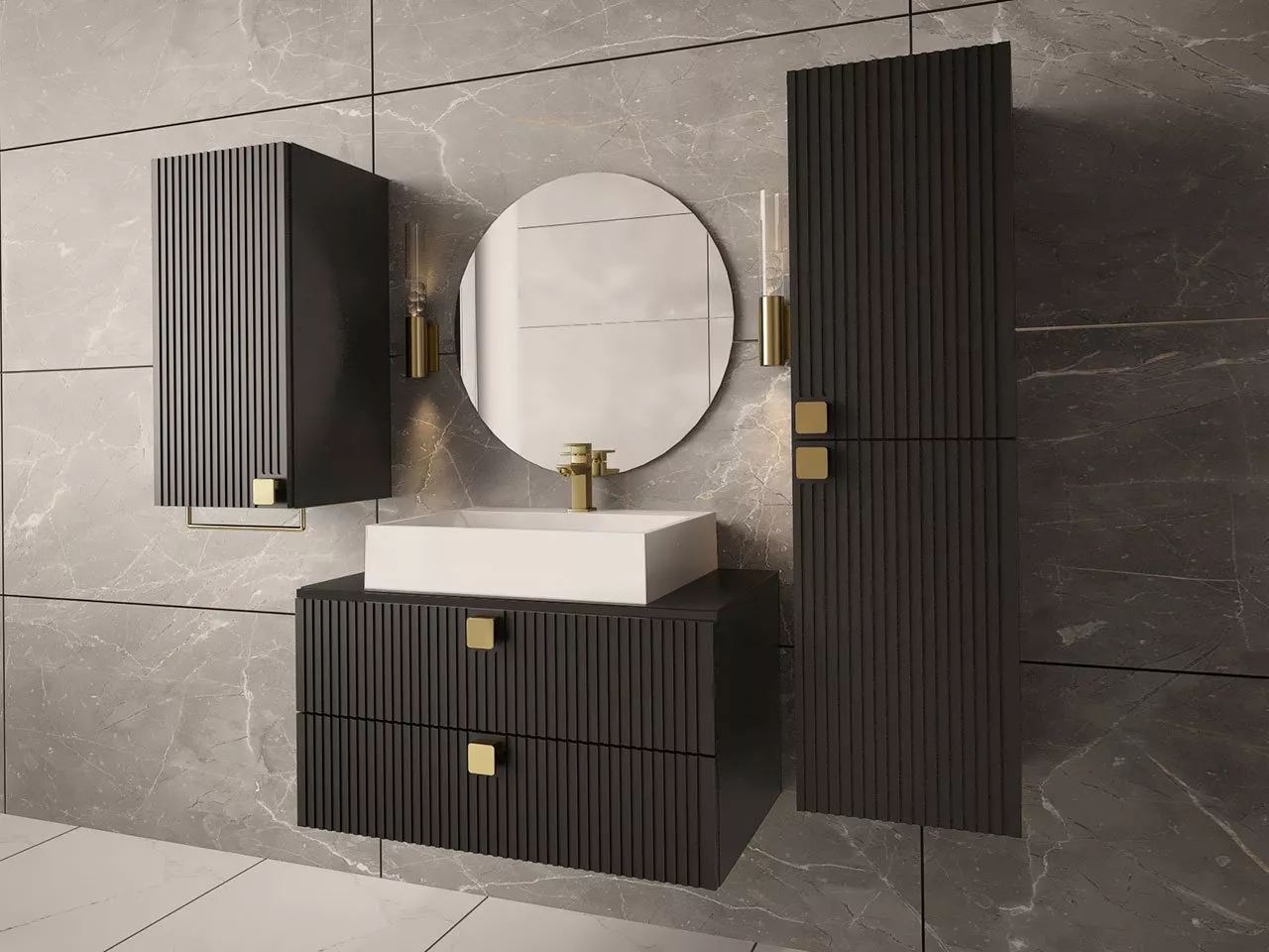 Závěsná koupelnová sestava PALOMA 1 se vyznačuje vysokou funkčností a odolností. Minimalistický vzhled nábytku doplňují frézované přední díly s elegantními zlatými detaily. Sestavu tvoří skříňka pod umyvadlo, uzavřené skříňky a umyvadlo.