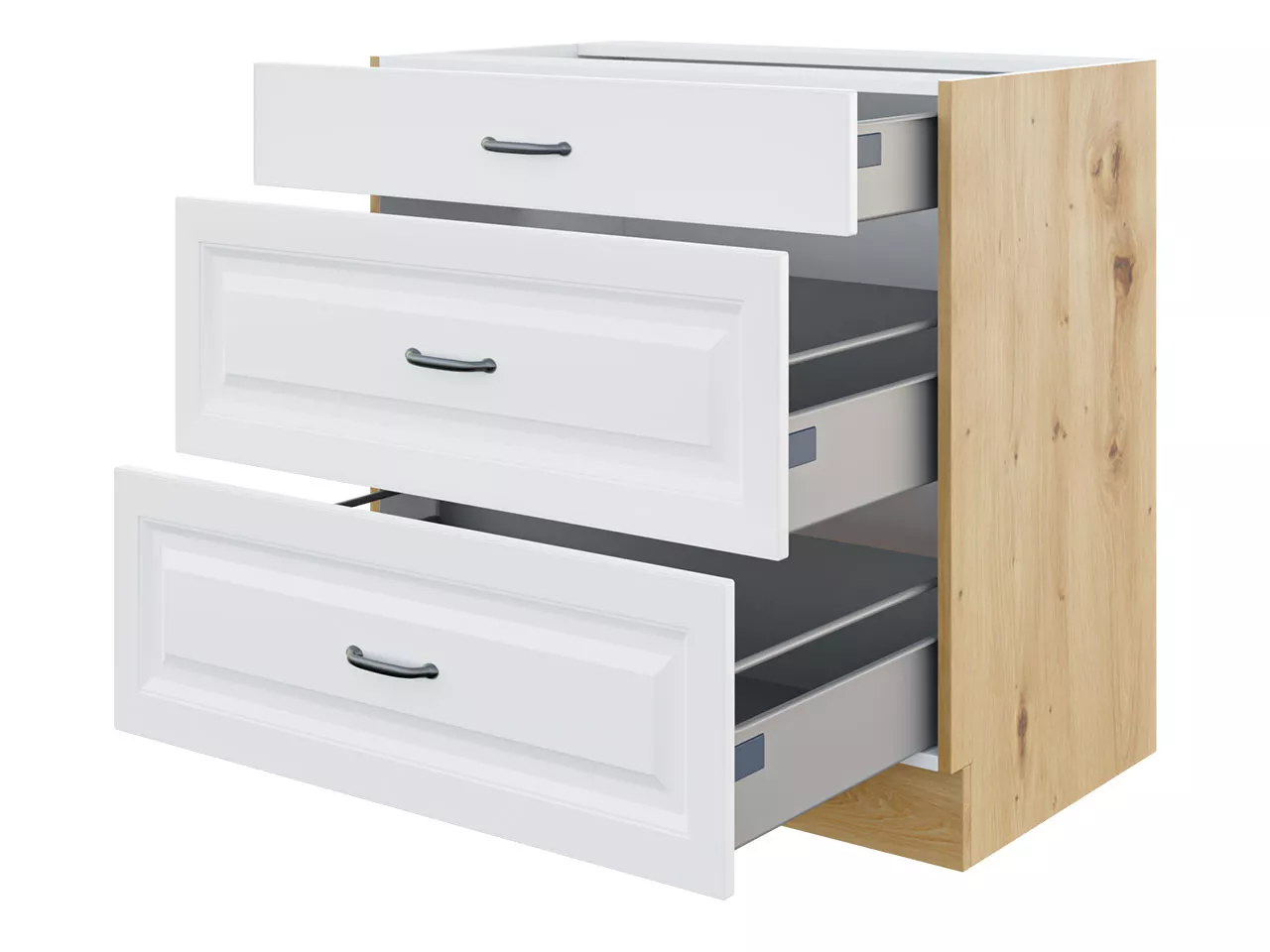 Dolní kuchyňská skříňka se zásuvkami SOPHIA je moderním kusem do kuchyně. Šuplíky umožní uložení vybavení kuchyně od hrnců, přes talíře ke krabičkám. Kuchyňské skříňky ze série SOPHIA jsou vybaveny inovativním systémem, který umožňuje tiché a bezpečné dovírání šuplků.