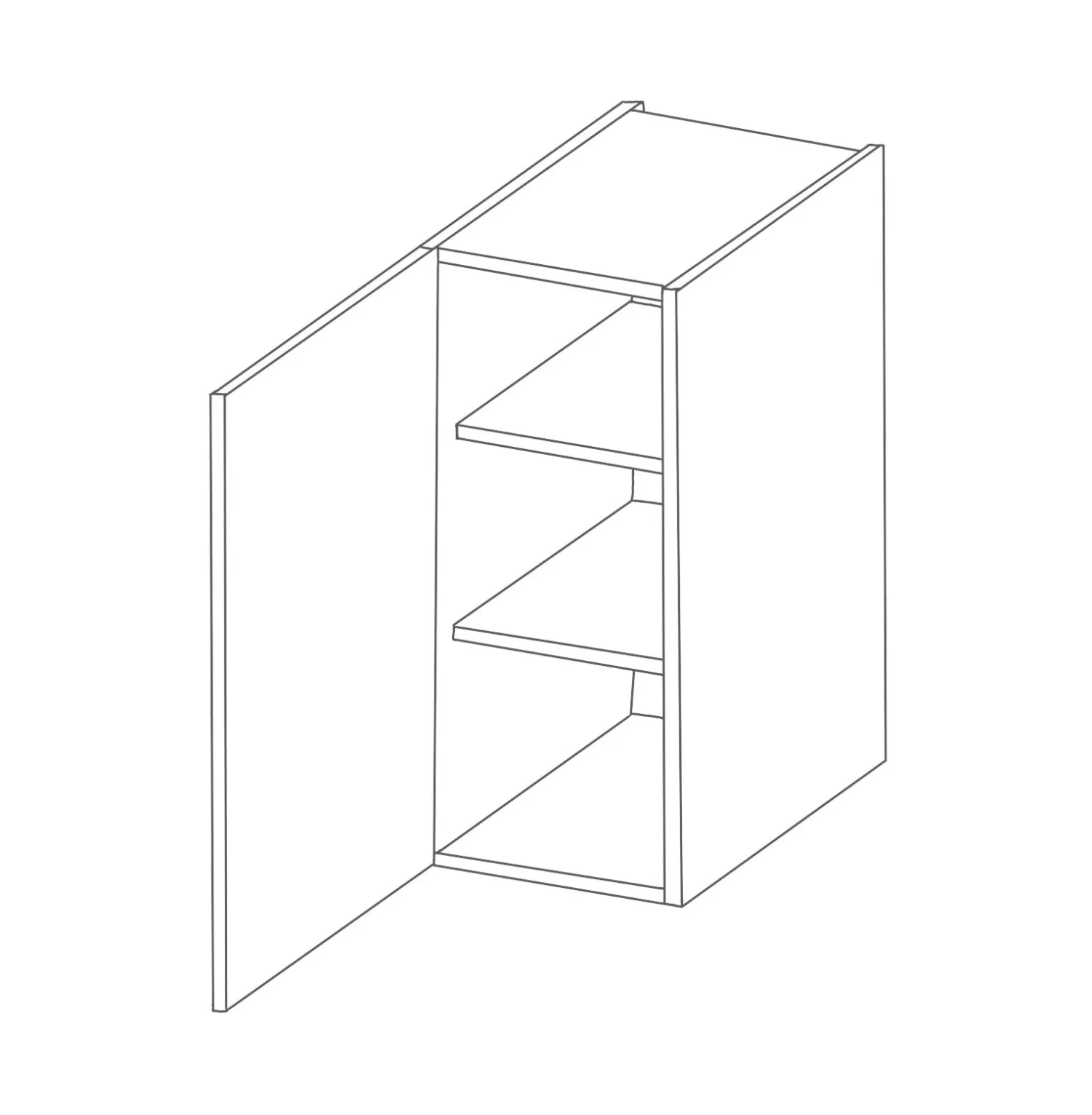 Funkční závěsná skříňka je vybavena tichým dovíráním. Dvířka jsou vyrobena z desky ve vysokém lesku a korpus v matné šedé barvě. Uvnitř skříňky jsou umístěny dvě police v matné bílé barvě.