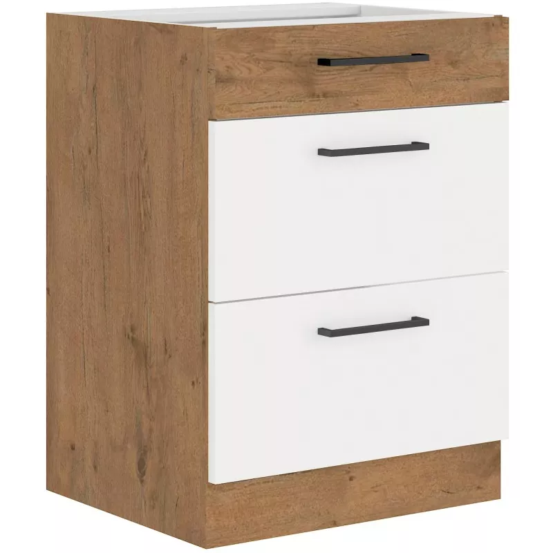Správný nábytek v jedinečném stylu je pro kuchyň velice důležitý. Kolekce VANYA je v oblíbeném odstínu dřeva v kombinaci s kontrastní bílou barvou, díky které nikdo neprojde kolem této kuchyně lhostejně. Kuchyně se neobejde bez skříňky se zásuvkami. Šířka 60 cm vám umožní schovat mnoho doplňků nebo hrnců. Různorodá velikost zásuvek vám umožní umístit sklenicena potraviny nebo kuchyňské roboty.