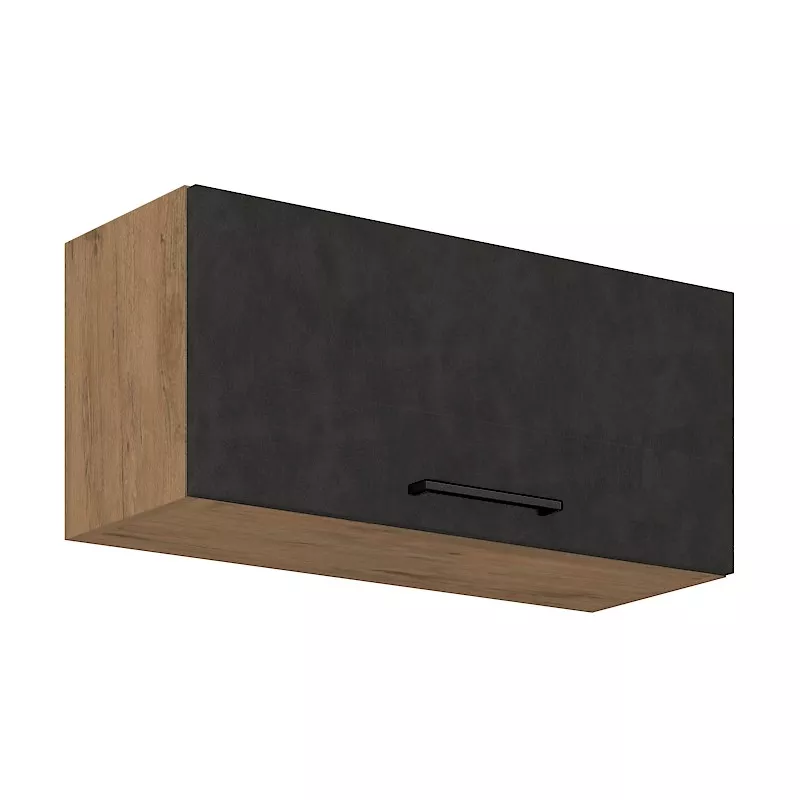 Nízká závěsná skříňka se sklopnými dvířky je určená pro vestavnou digestoř. Dvířka jsou v dekoru matera, zatímco korpus je z desky v dekoru dub lancelot a vnitřek v bílém matu.