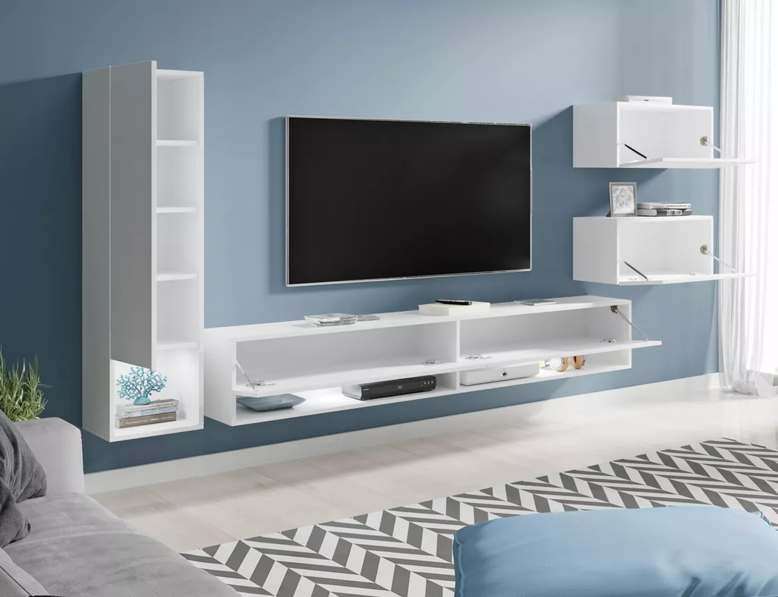 Obývací stěna XENIE se skládá z vitríny, 2 skříněk a TV skříňky. Stěnu je možné zavěsit i postavit.