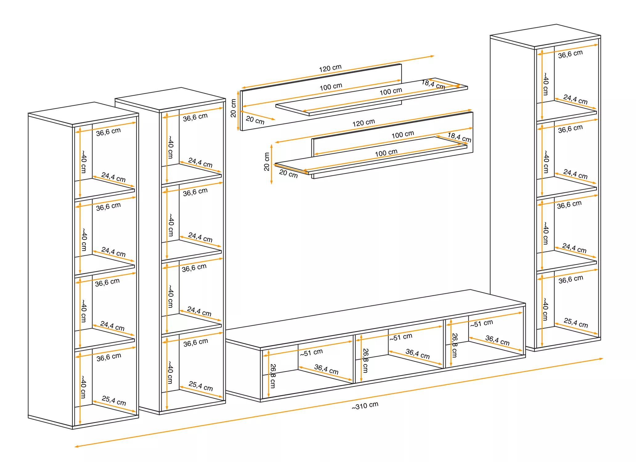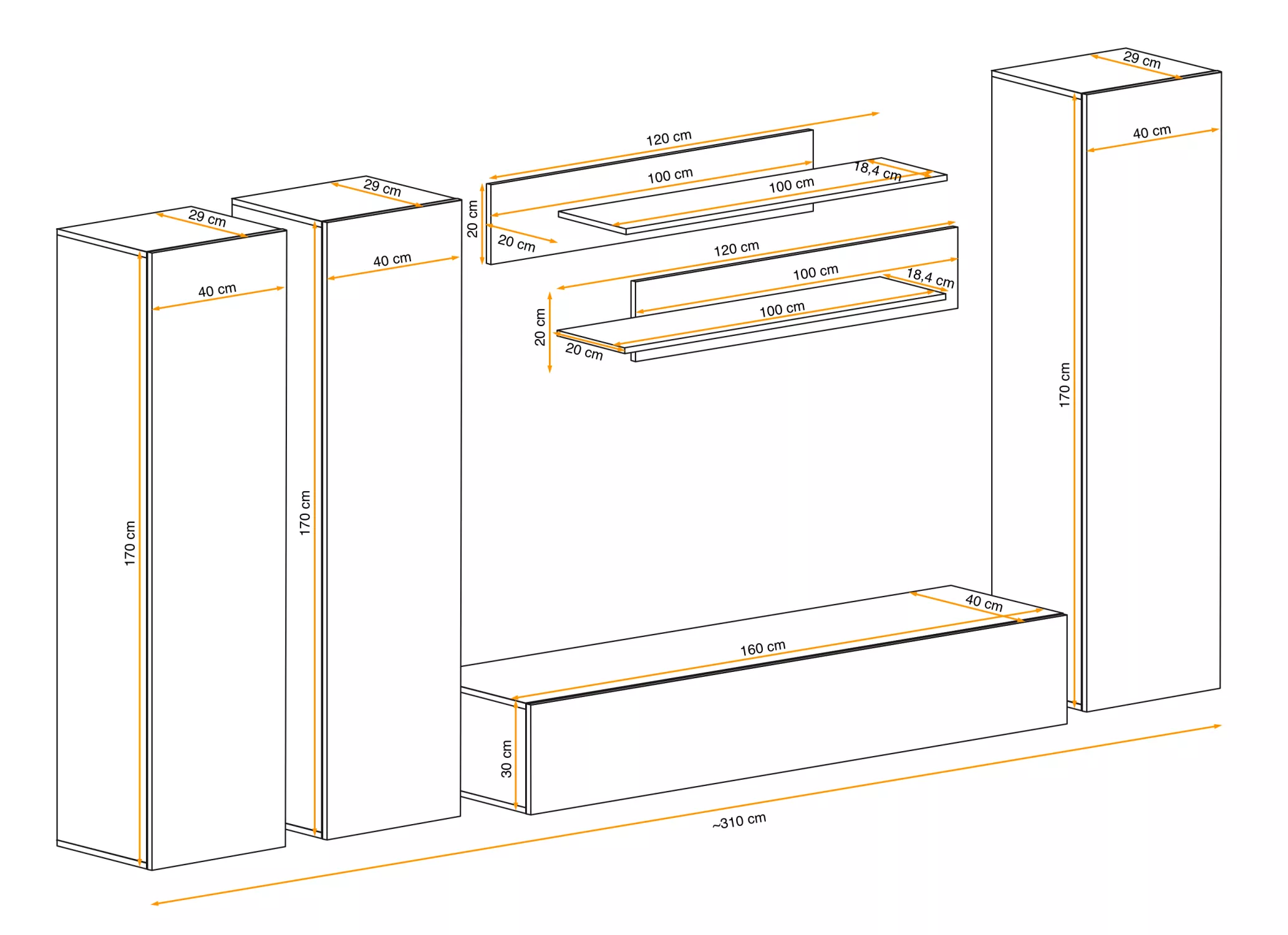 Sada nábytku do obývacího pokoje FREYA odkazuje na současné trendy v interiéru, které kombinují modernost a minimalismus. Prvním prvkem sady je TV stolek o šířce 160 cm, který je vybaven praktickou skříňkou pro úschovu elektronických zařízení nebo jiného příslušenství. Tři závěsné skříňky poskytují další úložný prostor pro domácí doplňky, dokumenty nebo knihy. Hluboké police poskytnou možnost k udržení dokonalého pořádku v obývacím pokoji.