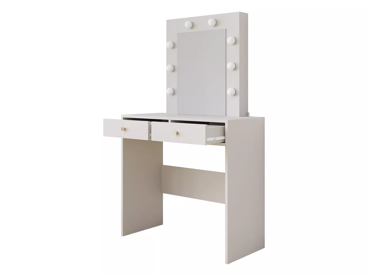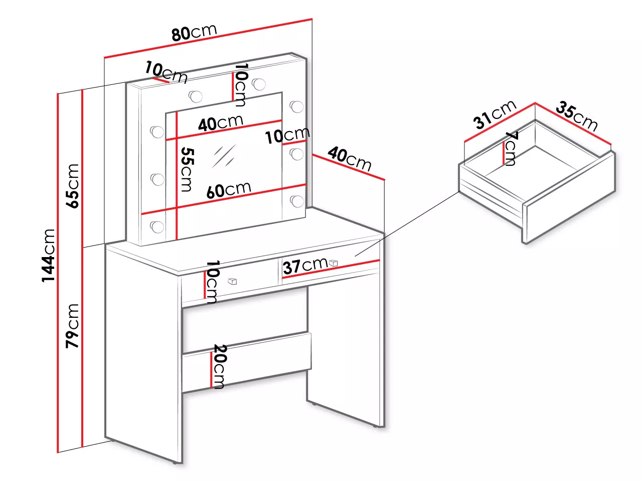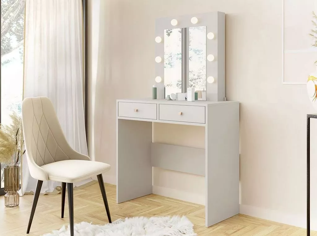 Toaletní stolek se zrcadlem IDALOU kombinuje eleganci, funkčnost a moderní design. Zrcadlo je vybaveno energeticky úsporným LED osvětlením, které poskytuje ideální podmínky pro líčení a péči o obličej. Prostorné zásuvky poskytují dostatek úložného prostoru na kosmetiku a líčení.