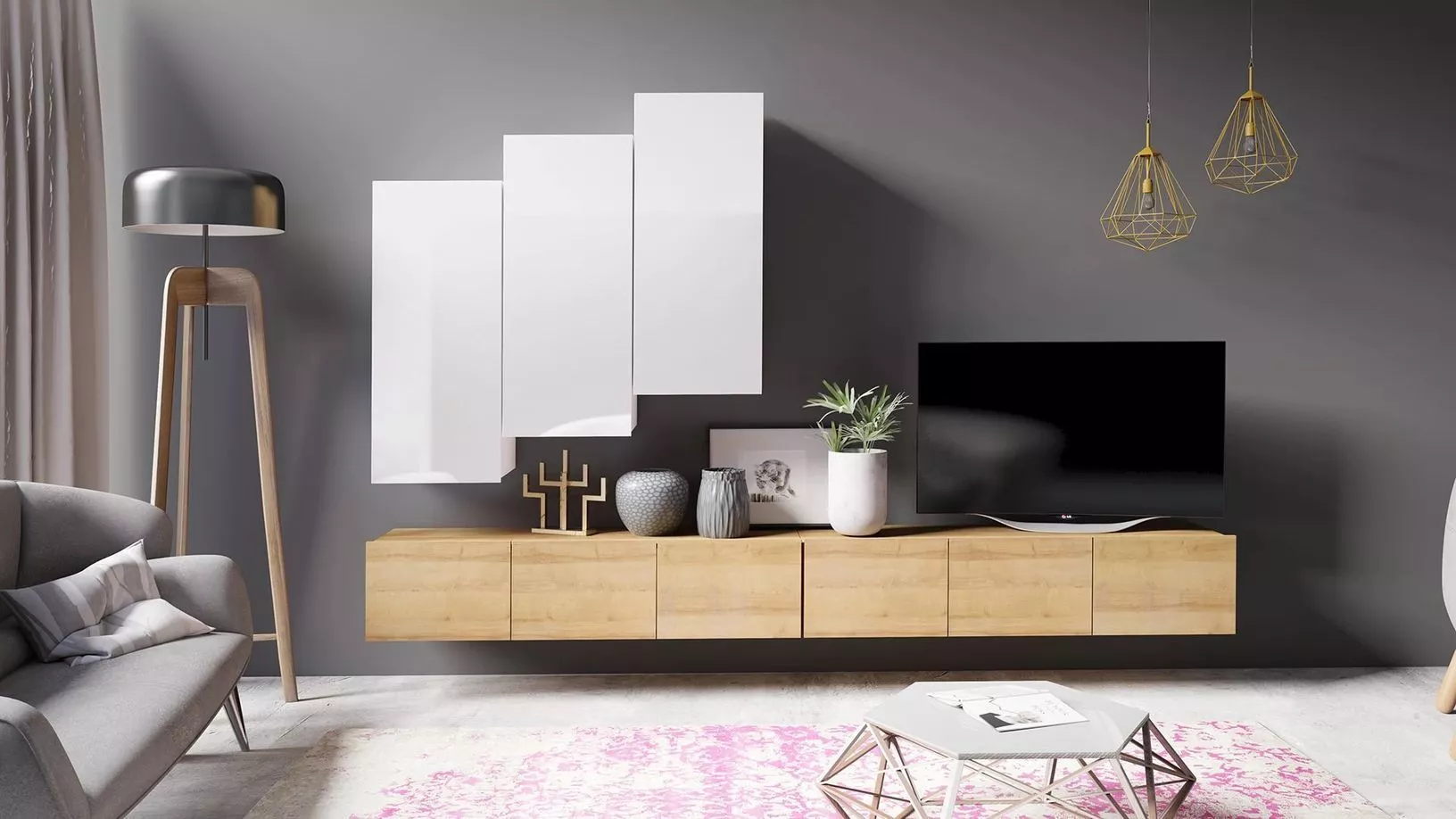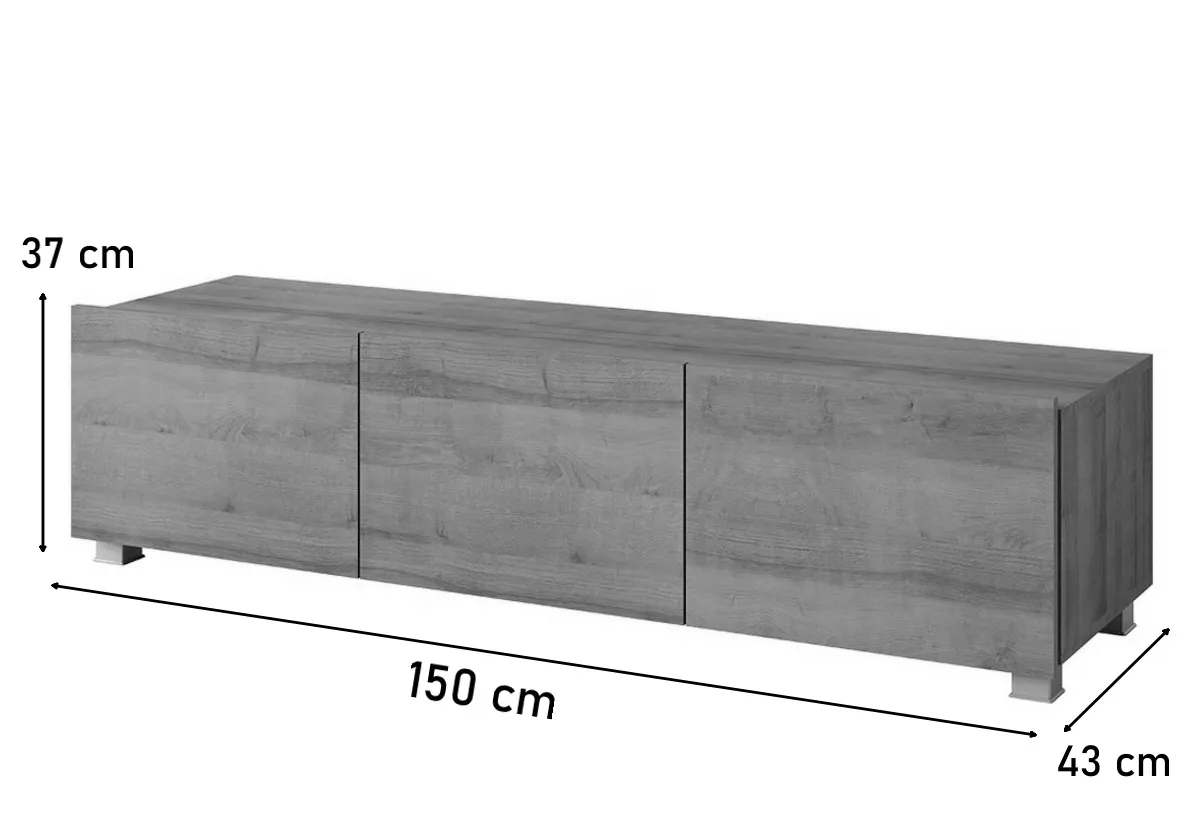 TV stolek Connor si můžete buď pověsit nebo nechat stát na podlaze. Horní plocha stolku je přizpůsobena pro umístění televize. Hrany jsou odolnější vůči každodennímu používání.